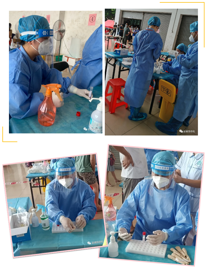 當(dāng)日,東莞天氣驕陽似火、烈日炎炎,室外氣溫高達(dá)三十多度。益誠自動(dòng)化五名志愿員分兩批輪班,投身抗疫一線。他們快速學(xué)習(xí)了工作要求,迅速上崗,承擔(dān)了醫(yī)護(hù)人員采樣輔助、封瓶、包裝檢測試管等工作。