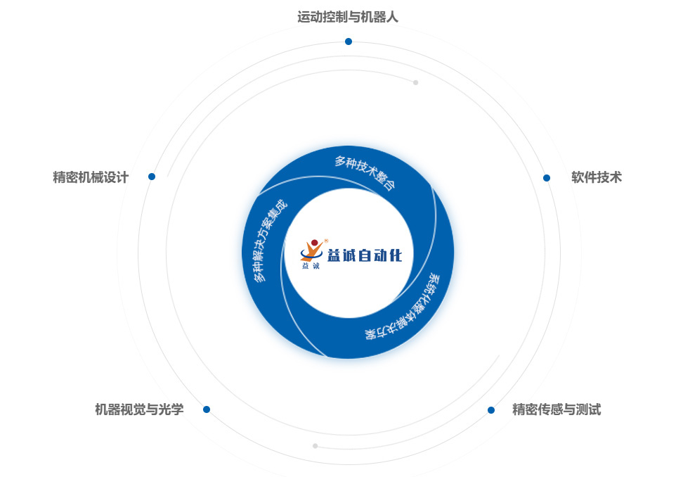 益誠(chéng)自動(dòng)化成立于2007年,已通過(guò)ISO9001:2015質(zhì)量管理體系認(rèn)證,是一家高新技術(shù)企業(yè),東莞市工程技術(shù)研究中心,設(shè)有一個(gè)博士工作站。總公司位于廣東省東莞市,在沈陽(yáng)、蘇州、印度尼西亞設(shè)有分公司,在香港特別行政區(qū)和德國(guó)設(shè)有辦事處。并與2021年在浙江、韶關(guān)自建智能制造工業(yè)科技園。益誠(chéng)自成立以來(lái)專業(yè)從事非標(biāo)自動(dòng)化生產(chǎn)設(shè)備、視覺(jué)定位與檢測(cè)、工業(yè)多軸機(jī)器人的研發(fā)、制造與服務(wù),以及為生產(chǎn)企業(yè)提供智能制造整體解決方案。益誠(chéng)擁有一支由100余名專業(yè)工程開(kāi)發(fā)人員組成的研發(fā)團(tuán)隊(duì)。在汽車配件、電子電器開(kāi)關(guān)插座、精密微型馬達(dá)、散熱風(fēng)扇、機(jī)械手等生產(chǎn)領(lǐng)域,為各生產(chǎn)企業(yè)提供多元化的自動(dòng)化解決方案。為使益誠(chéng)的研發(fā)能力能得到持續(xù)提升,為市場(chǎng)提供更優(yōu)質(zhì)的服務(wù),益誠(chéng)與國(guó)內(nèi)多家高等院校建立了”產(chǎn)、學(xué)、研“合作關(guān)系,并與德國(guó)著名的自動(dòng)化設(shè)備制造商”SUSO Automation“結(jié)成戰(zhàn)略合作伙伴。